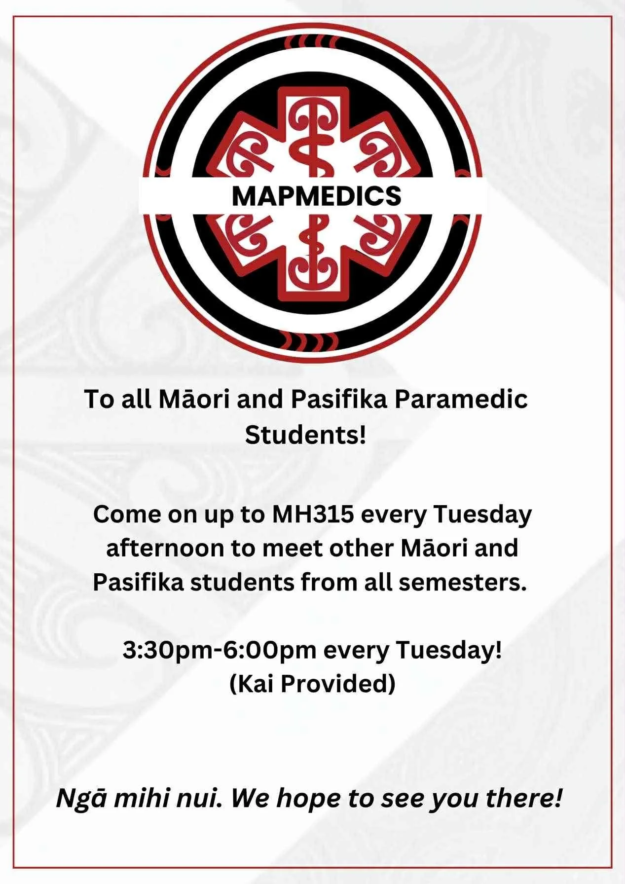 Come on up to MH315 every Tuesday afternoon at 3.30pm to meet other Māori and Pasifika paramedic students from all semesters.